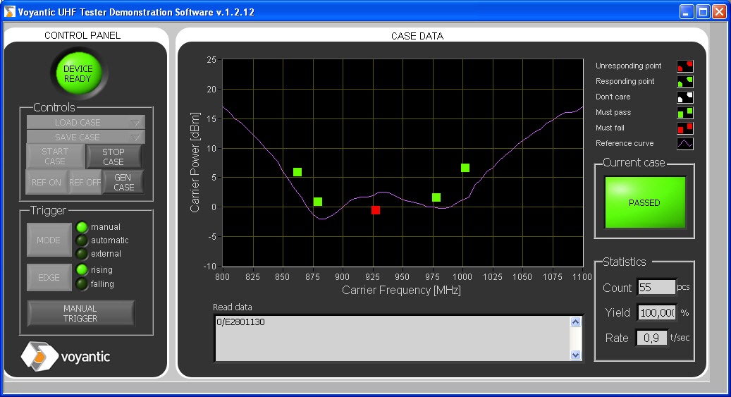 Wichtige Parameter wie die Empfindlichkeit eines Transponders sowie die vom Transponder rückgestrahlte HF Leistung können Inline in der laufenden Produktion bestimmt und in Echtzeit gegen Referenzwerte verglichen werden. Diese Verfahren ist dem bisher üblichen Go/NoGo (Gut/Schlecht Erkennung) Test gerade im UHF Bereich in jeder Beziehung überlegen und die einzige Möglichkeit, Transponder nach Ihren tatsächlichen Parametern zu qualifizieren.