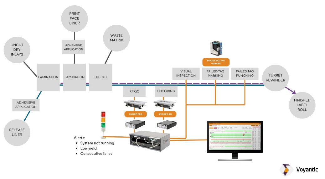 Darüber hinaus ermöglicht Tagsurance 3 die Codierung mit derselben Systemkonfiguration. Die integrierte Codierungslösung macht separate Geräte und eigenständige Prozesse überflüssig, vereinfacht die Maschinenarchitektur und reduziert die Komplexität der Integration (siehe Abbildung des Beispielsystems unten).